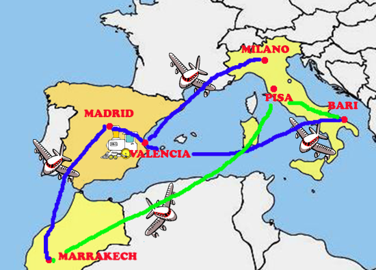 We are going to leave from Bari and Milan to Valencia. We’ll stay there for 2 nights. After that we are going to take a train for Madrid where we are going to stay 3 nights and after that we’ll fly to Marrakech for 5 nights. We’ll come back in Italy with a little stop in Pisa and than back to Puglia.