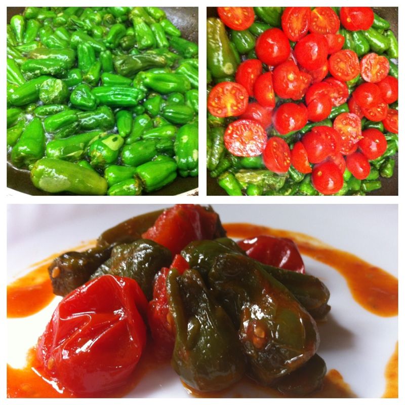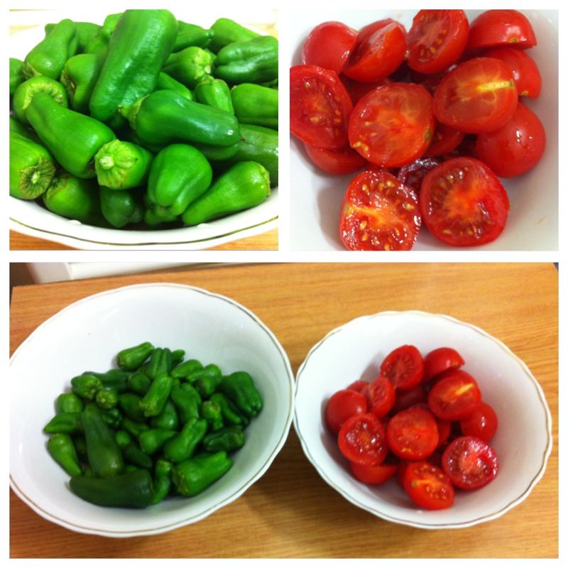 Occorrono un piatto di diavulicchi brindisini (una varietà di peperoni dolci e piccanti), pomodorini e un bicchiere di vino (o forse 2 così puoi berlo mentre cucini come ho fatto io) 🙂